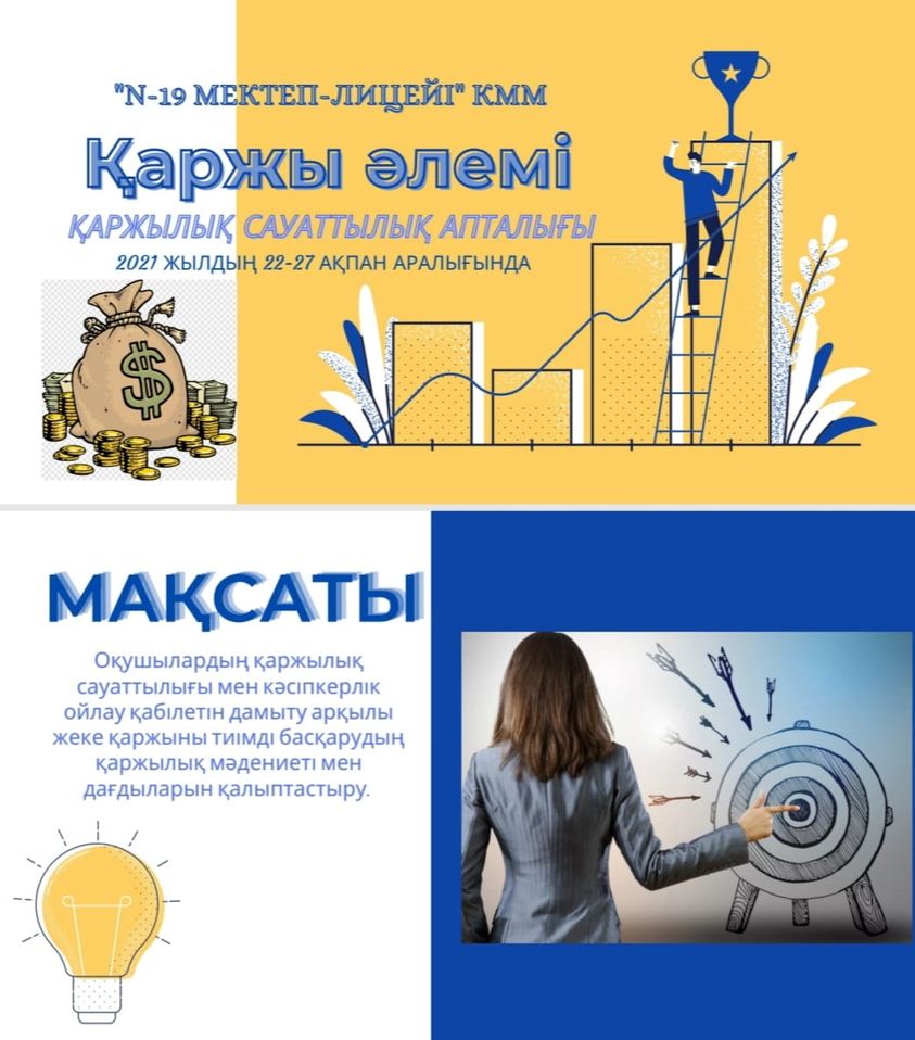 Бұл функционалдық сауаттылық апталығының мақсаты: Оқушылардың қаржылық сауаттылығы мен кәсіпкерлік ойлау қабілетін дамыту арқылы жеке қаржыны тиімді басқарудың қаржылық мәдиниеті мен дағдыларын қалыптастыру.