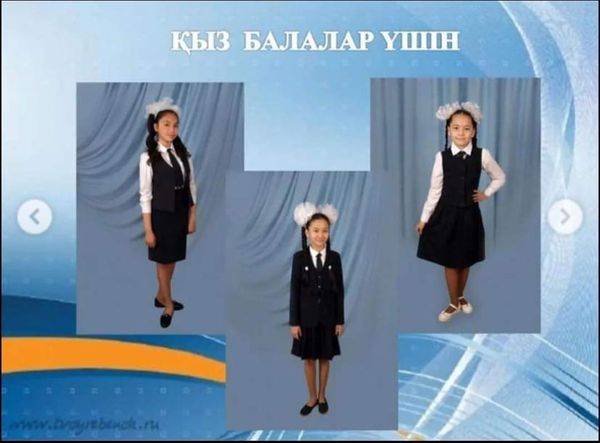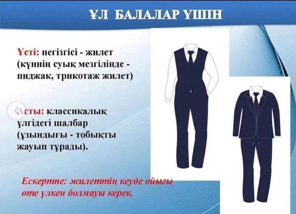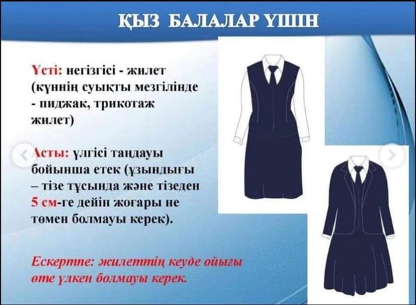 Құрметті ата-аналар! Жаңа 2022-2023 оқу жылына жолақтарсыз, торсыз, шотландкасыз қою көк түсті мектеп формасын сатып алуға кеңес береміз. Мектеп формасына орта білім беру ұйымдарының айырым белгілерін (эмблема, жапсырма, шеврон және т. б.) орналастыруға рұқсат етіледі.